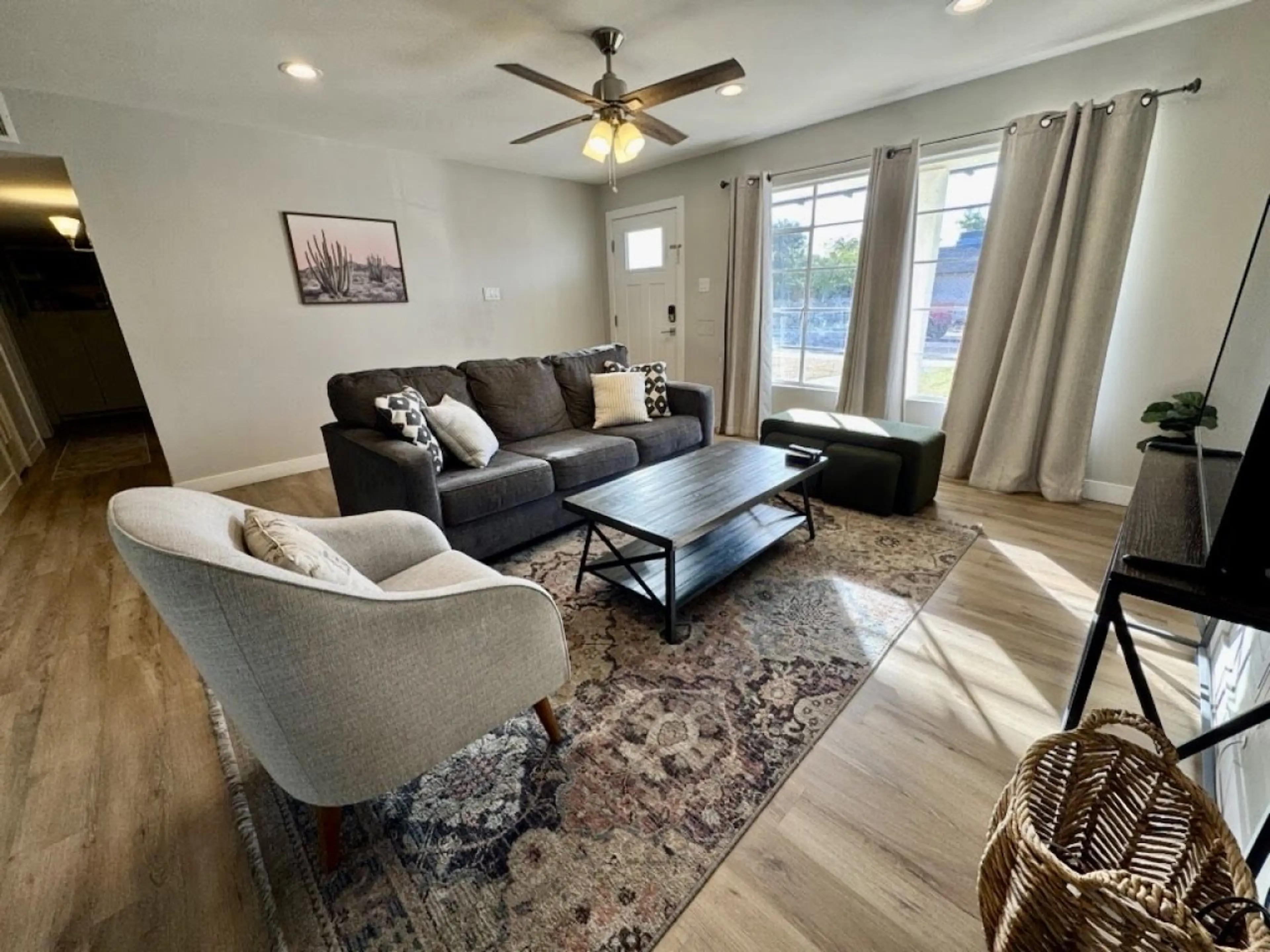 My family and I stayed at this house over Christmas through New Year’s weekend. We had 5 adults in our group. The house was clean, spacious, and in a great location. All pictures are accurate and as described. The house is very close to Old Town and a variety of restaurants. There is a pharmacy & grocery store with a Starbucks on the next block which is walkable. The street was quiet at all times of the day & night. There was plenty of room for parking. Two cars can easily fit in the driveway and plenty of parking on the street. I have a few suggestions. First, there is not enough seating in the living room for five people to sit comfortably. The couch comfortably seats two and one chair. The kitchen table only seats 4 people. If the house sleeps 8 people there should be enough comfortable seating for 8 people to sit and watch tv. Second, all bed pillows should be encased in some sort of hypoallergenic enclosure. They only had pillow cases over them and that’s just not sanitary. Third, there is no place to unpack or sit anything on top of besides night stands in the bedrooms. The twin bedroom only has one nightstand to share between two people. Yes, there are closets to hang up clothing but nothing else other than night stands. We had to live out of suitcases on the floor. For a 10 day rental, that’s not ideal. Overall, I would rent again but would hope the owner invests in some better/additional furniture options.